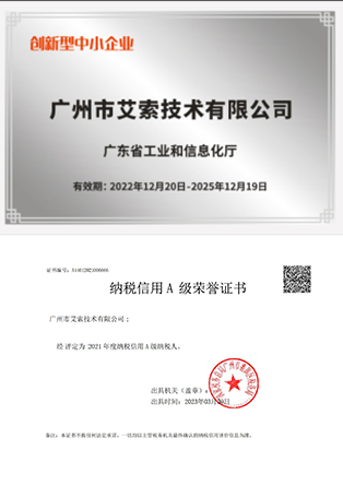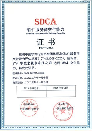 艾索先后通過國家高新技術企業、創新型中小企業、專精特新中小企業、兩化融合管理體系A級、軟件服務商交付能力等級、廣東省守合同重信用企業等企業資質認定,獲得質量管理體系、環境管理體系、職業健康安全管理體系、信息技術服務管理體系、信息安全管理體系等國際認證,以及知識產權管理體系、商品十星售后服務評價體系、企業誠信管理體系、4A級標準化等級評價體系、綠色供應鏈管理體系、業務連續性管理體系等國家認證。